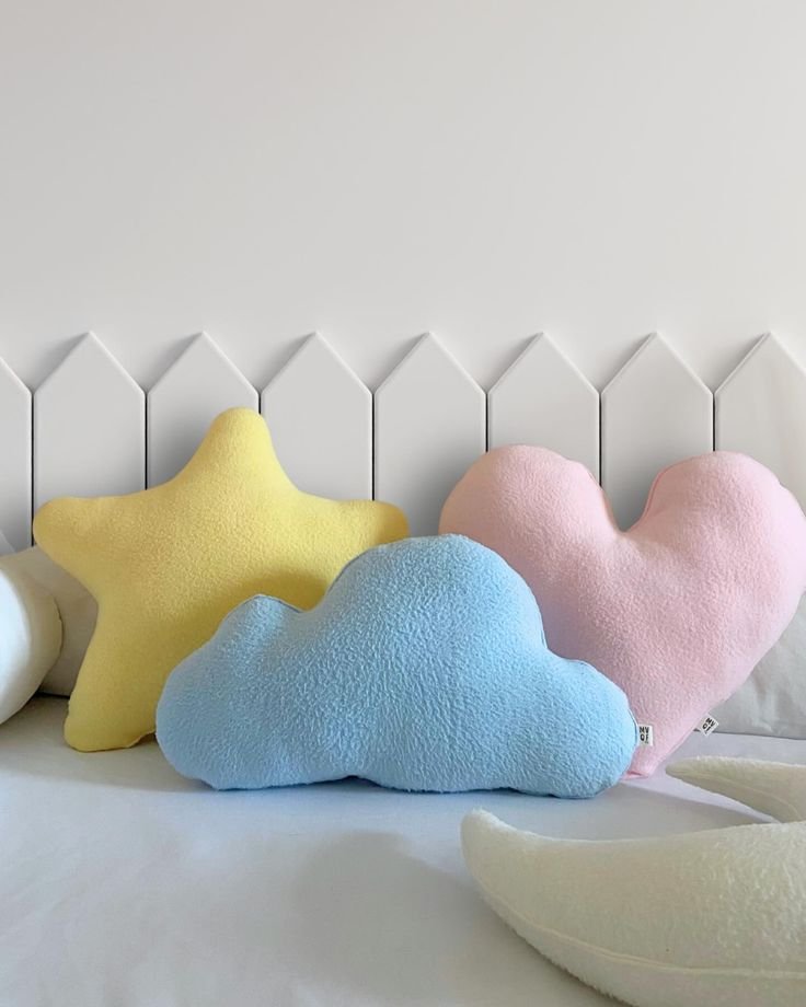 Almofadas com o nome da criança, formatos divertidos ou estampas exclusivas dão personalidade ao quarto.