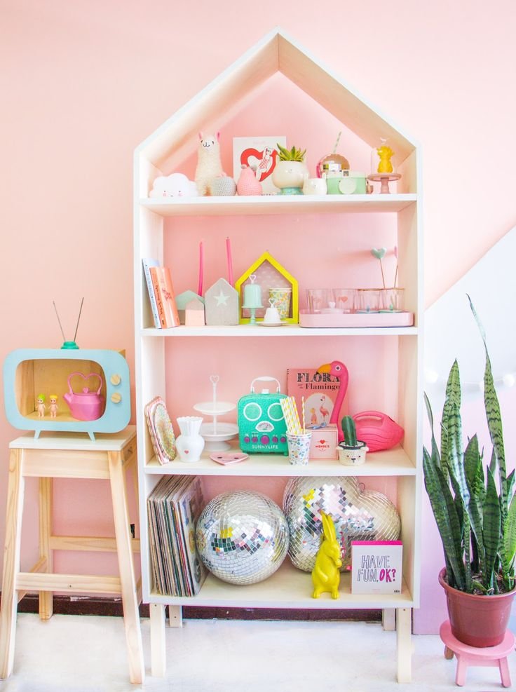 Essas prateleiras em formato de casinha estão super em alta e são perfeitas para expor livrinhos, pelúcias e objetos decorativos.