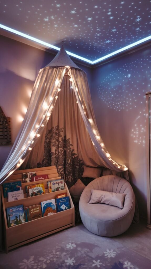 - Cantinho de leitura aconchegante com almofadas e iluminação suave