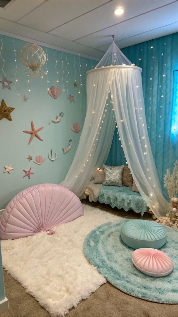 - Sereias e Fundo do Mar: Azul turquesa, lilás e elementos marinhos delicados
