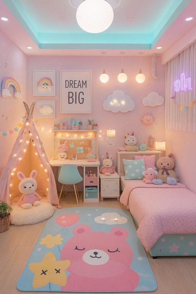 - Luminárias em formatos lúdicos (lua, nuvem, estrela, unicórnio)